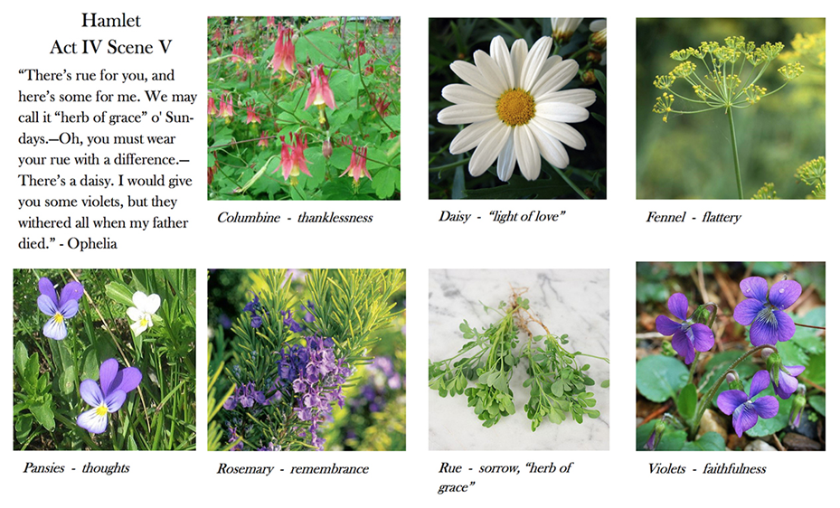 To Claudius, she gives flowers that represent flattery and ingratitude, and to Gertrude she gives her rue which is for both repentance and sorrow, so when she says that Gertrude needs to wear hers with a difference, she means for Gertrude it’s repentance, for Ophelia it’s for sorrow.