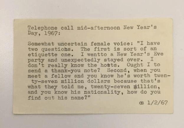Lastly, check out this. Libraries used to be “Google” in that people would call a library to find out information. Not long ago, the questions gathered by librarians in the New York City library were discovered. This one looks like it should have been dated 1922 (not 1967):
